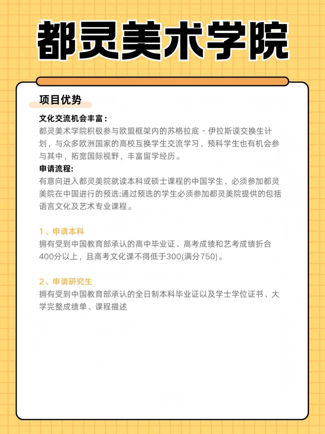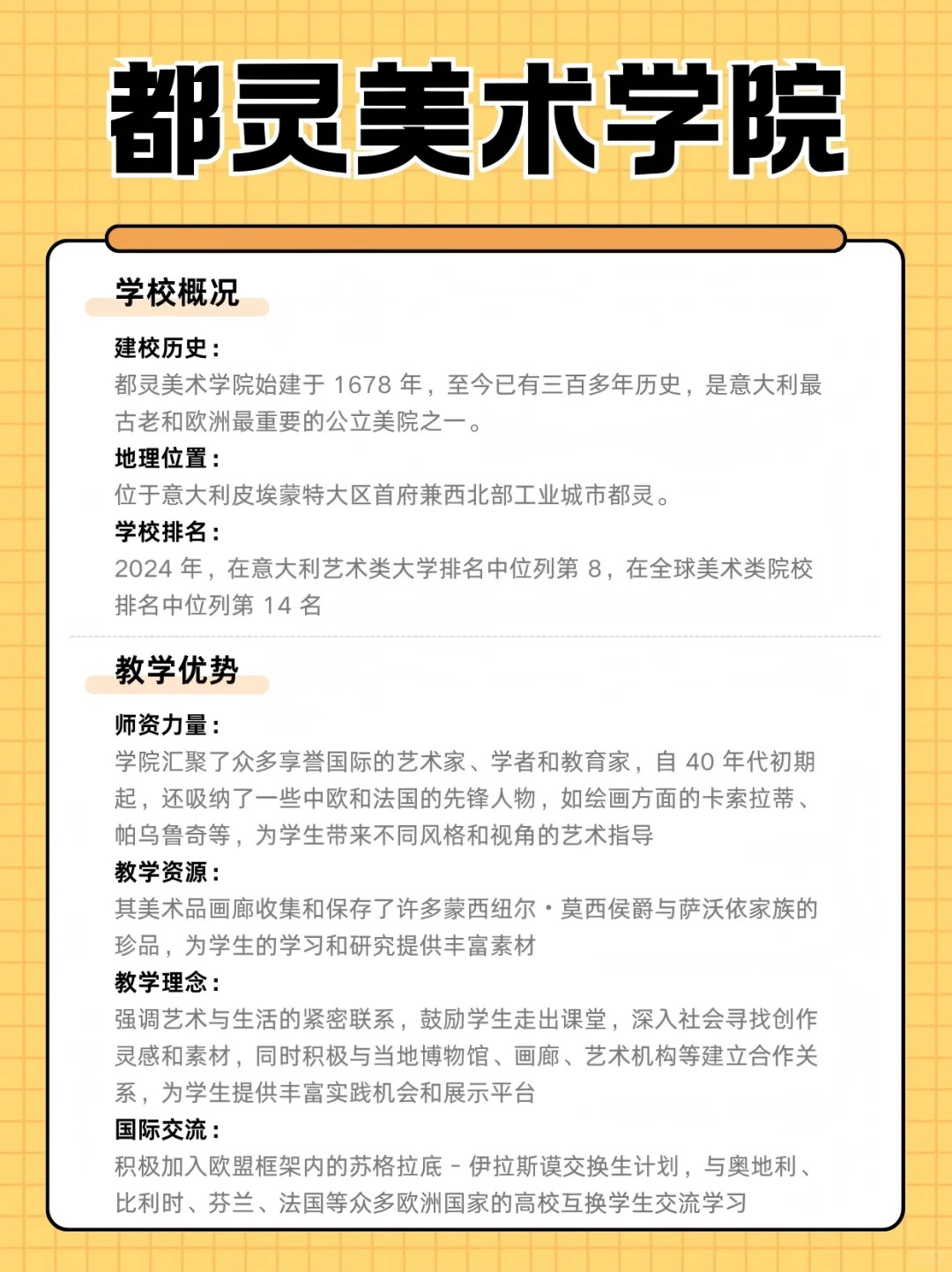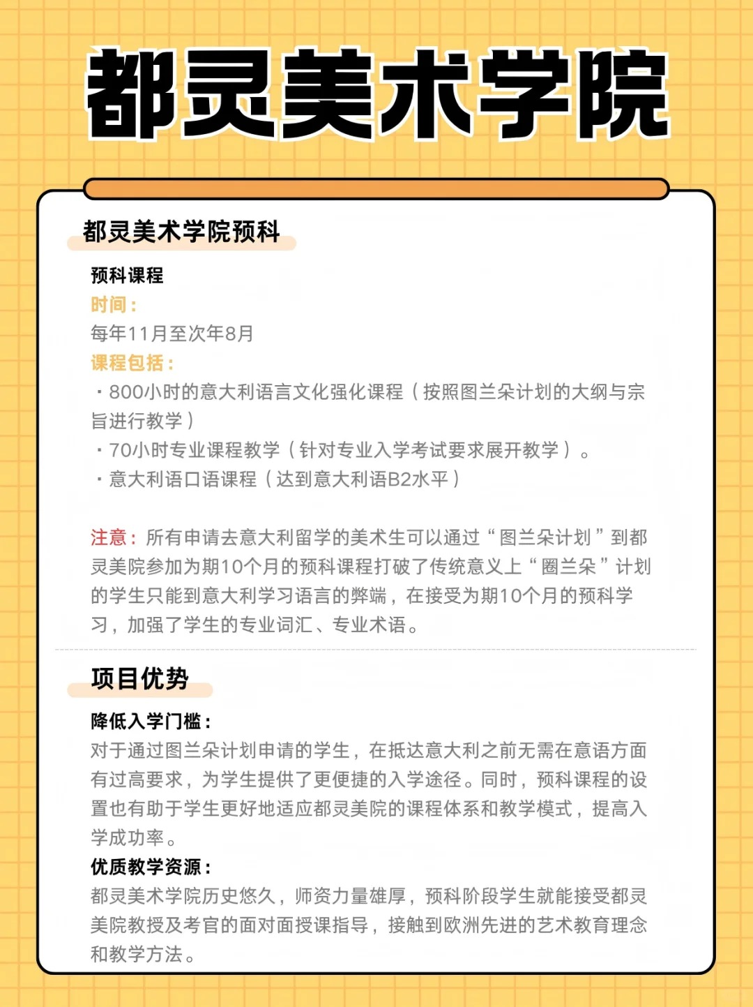 ?都灵美术学院始建于 1678 年,位于意大利皮埃蒙特大区首府都灵。这所拥有近三个世纪历史的学院,在艺术领域的影响力不容小觑!也是很多艺术生的梦中情校 对于中国留学生来说,想要申请都灵美术学院或者意大利美术学院,除了国际生途径之外,还可以选择申请都灵美术学院预科? 【预科优势】 ✅通过预科项目,提前锁定名校入学名额,升学更有把握 ✅预科课程涵盖语言学习、专业强化以及艺术史,全方位提升 ✅提前熟悉上课环境和授课节奏 ✅不仅如此通过图兰朵计划申请都灵美术学院预科,简直是 “双重保障”: ▪️先通过计划锁定院校名额,再读预科强化专业能力 ▪️语言课程 + 专业预科无缝衔接,比直接申请少走 N 多弯路 . 【都灵美术学院预科优势】 ✅ 城市生活成本低(对比米兰/罗马友好太多) ✅ 教学质量高、老师认真负责、升学路径清晰 ✅ 学院和意大利多个美术馆、画廊有合作资源,适合想沉下心来学习的同学 ✅ 拿到B2后可报考包括都灵美院在内的其他意大利公立美院 【适合人群】 ? 零基础但想学艺术的同学 ? 高中毕业后想直接升本的学生 ? 本科想申请都灵美院硕士,需要作品集/语言提升的同学 ?跨专业、跨学历申请本科或硕士的艺术生 ?想进入都灵美术学院就读的目标明确型选手! . 【关于我们】 ?提供一对一留学规划 ?院校/专业匹配指导 ?材料/语言/作品集全流程辅导 ?协助办理注册/住宿/签证等手续