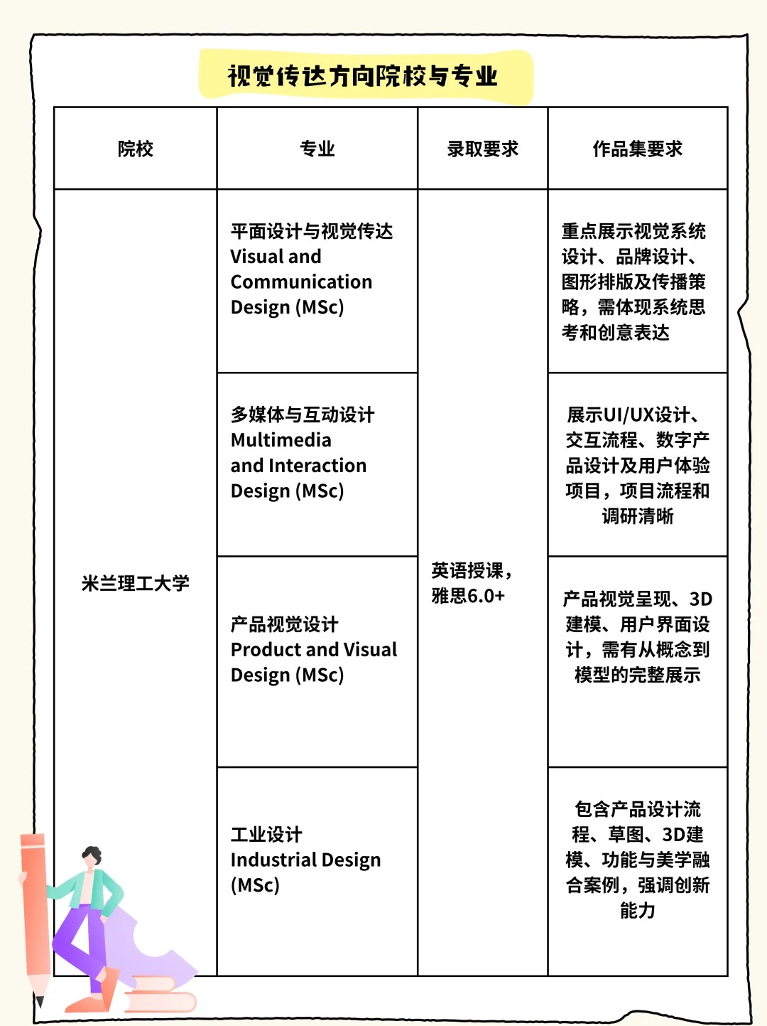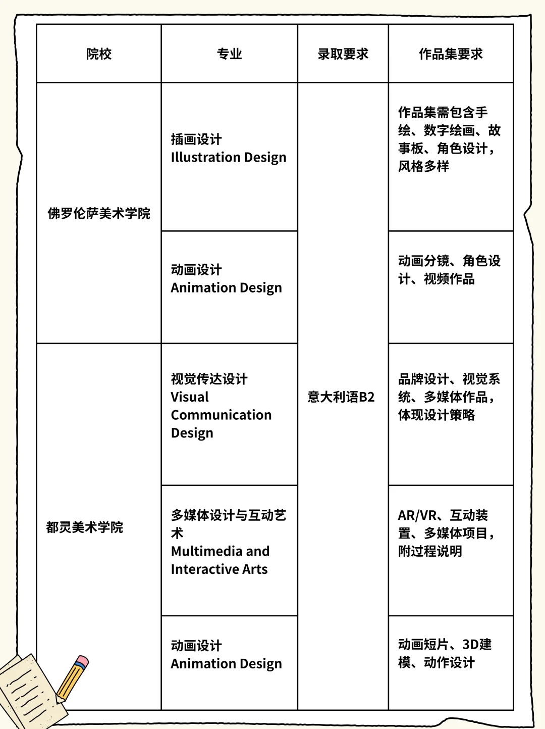 意大利的视觉传达设计专业(Visual Communication Design / Comunicazione Visiva)在欧洲设计界占有重要地位,融合了传统美学与现代数字技术,培养具备图形设计、品牌策略、数字媒体、交互设计等综合能力的设计人才。 为了帮助正在规划留学的小伙伴,我整理了几所有综合类大学和公立美院,供大家参考。 📄【申请这些美院你需要准备什么?】 📌 申请要求总结如下:学历背景:本科毕业,艺术类优先; 语言要求:雅思6.0/意大利语B2 材料准备:成绩单、推荐信、语言证明、作品集(最关键) 【作品集是门槛也是通行证】意大利美院通常要求提交3-5个完整项目,具体数量因学校而异。若提交三个项目以下,则无法全面展示学生的专业能力,作品集内容将显得单薄。若提交五个项目以上,则容易使人感觉冗余,无法凸显个人作品风格的代表性,言多必失,作品过多也容易暴露缺点。在作品集数量方面,美院教授更多看重的是质量而非数量。 很多中国学生在作品集准备上的常见误区是:只关注展示最终作品,忽略草稿及所涉及的实验步骤过程。 比起作品本身,意大利美院教授更希望看到的是创作心路历程和各种尝试,比如: ● 灵感来源 ● 草图 ● 材料实验 ● 失败尝试与改进 ● 最终成品展示 作品种类多样化,展现完整的综合能力意大利美院鼓励学生多在作品中尝试不同的技法和媒介, 作品集可以囊括: ● 传统绘画作品 (油画、水彩、版画、新材料绘画等); ● 雕塑/装置/立构模型; ● 数字艺术(摄影、视频、动画等); ● 行为艺术/概念艺术等。 🧭【我是谁?我能帮你做什么?】 我是Cinzia,曾在意大利留学4年,就读于都灵理工大学 回国后从事欧洲留学规划5年,目前自己运营留学公司,专注帮助中国学生申请意大利等国家的高性价比留学路径。 📩 如果有留学方面的问题,欢迎留言or私信我!